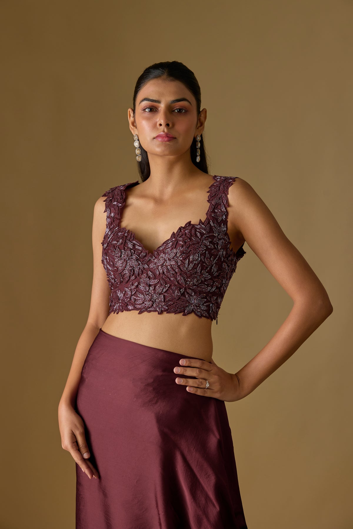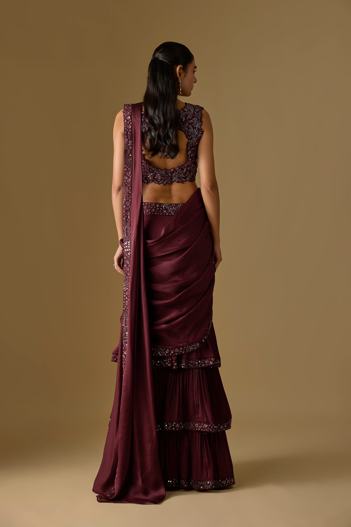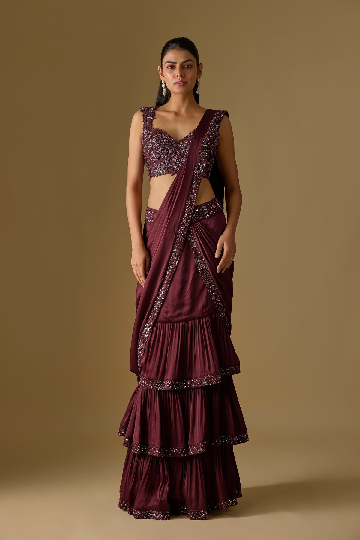 Elevate your festive elegance with the Baylin Drape Saree, a luxurious wine pre-draped saree designed for effortless sophistication. Crafted in soft satin and delicate tulle, it features a beautifully detailed floral blouse that adds a modern romantic touch. This ready-to-wear silhouette ensures comfort, grace, and quick styling for any special occasion. A two-piece ensemble perfect for weddings, celebrations, and evening events. Ideal for women who love contemporary glamour with traditional charm.