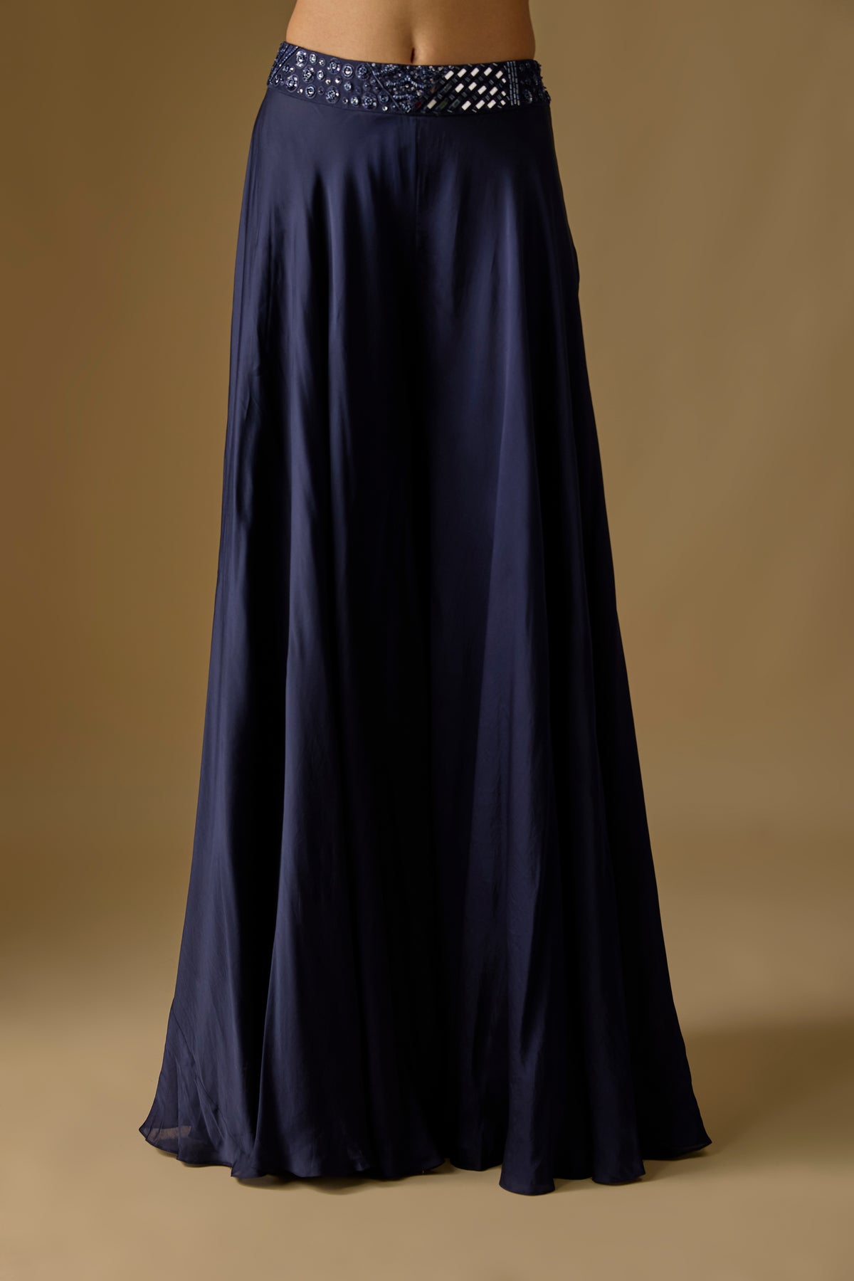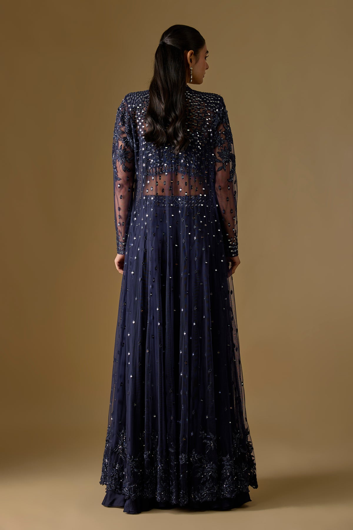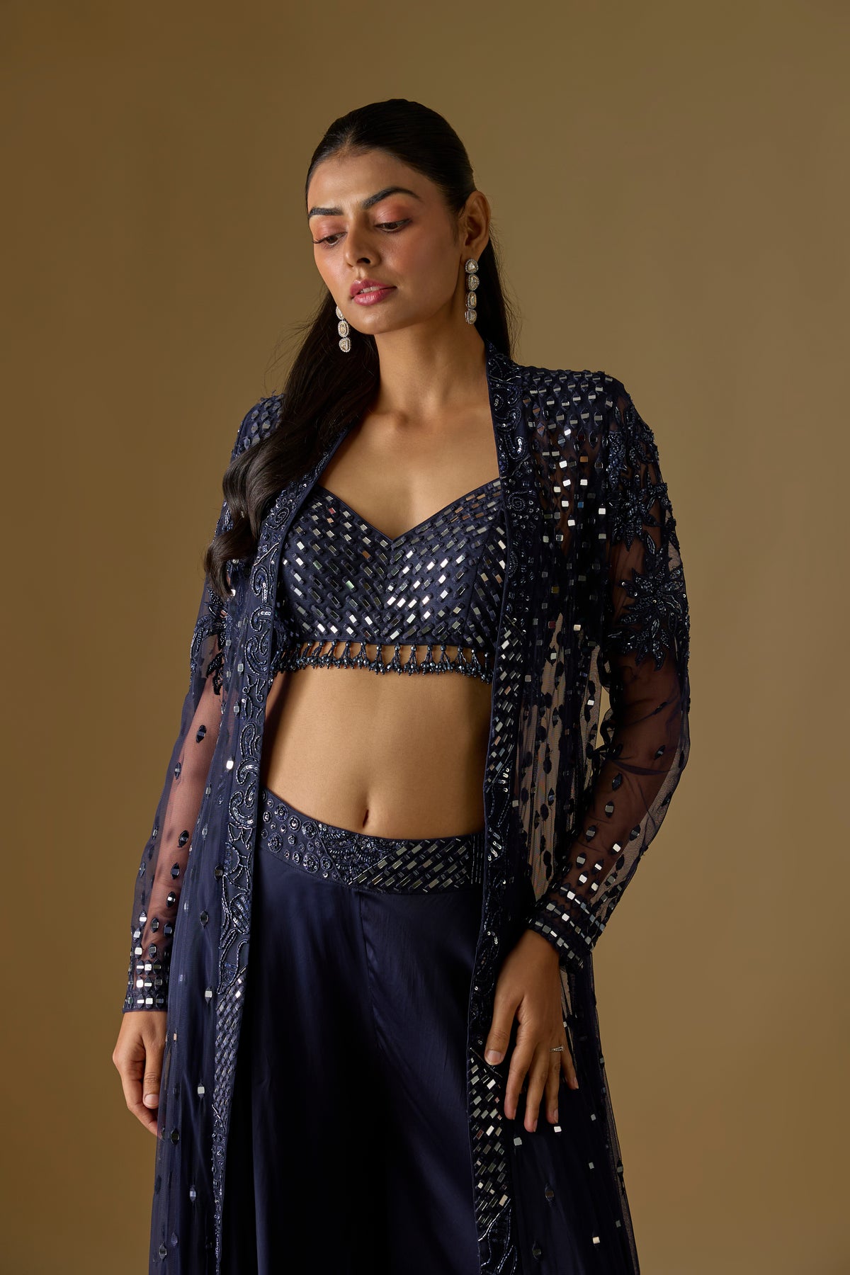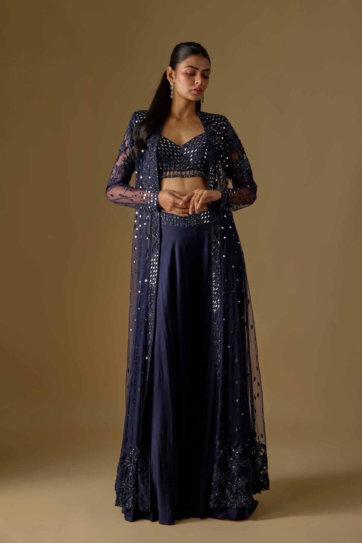 Brook Long Jacket Set showcases a stunning navy blue long jacket paired with a flowy sharara and a mirror-work blouse for a refined festive look. Crafted in premium satin and tulle, this three-piece ensemble blends elegance with contemporary charm. The intricate mirror detailing adds sparkle, making it perfect for weddings, celebrations, and evening occasions. Elevate your style effortlessly with this luxurious Asaga signature set.