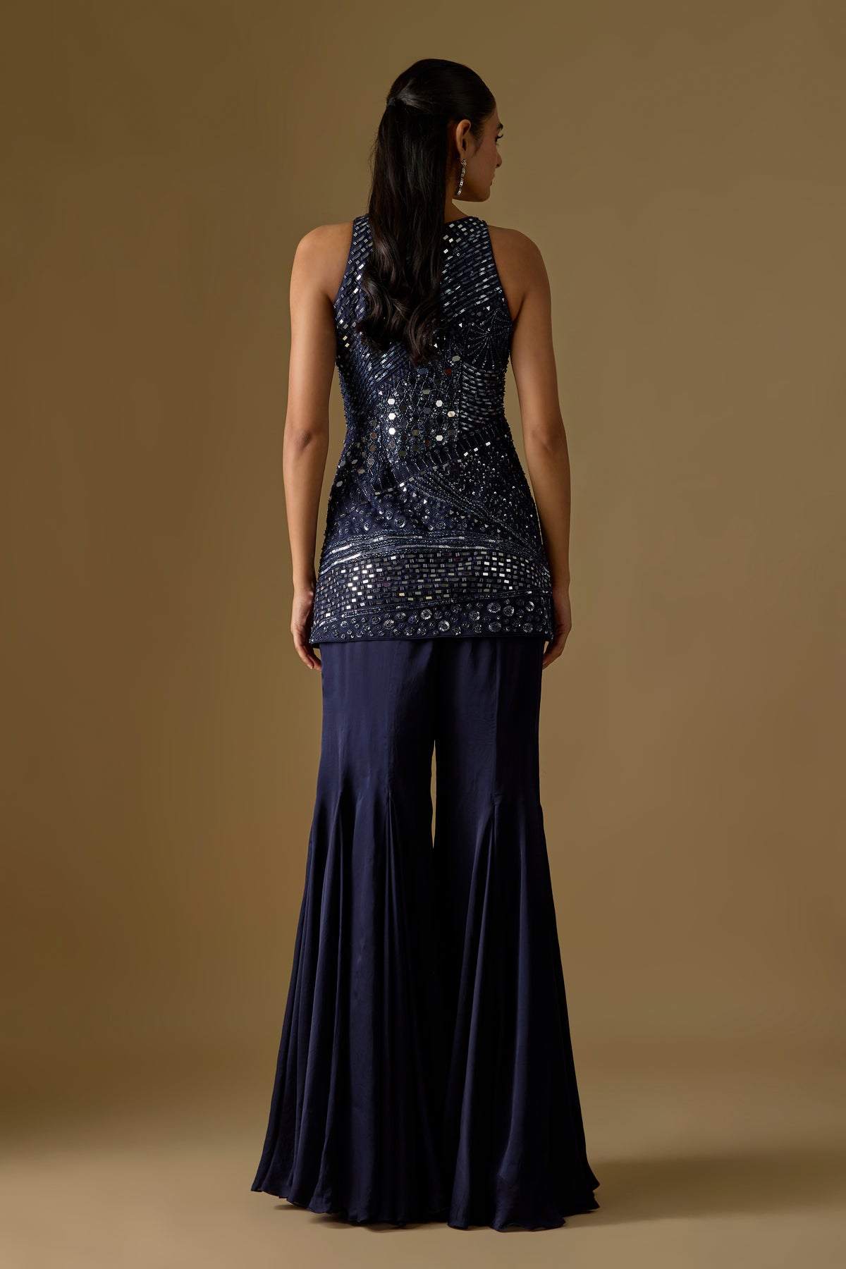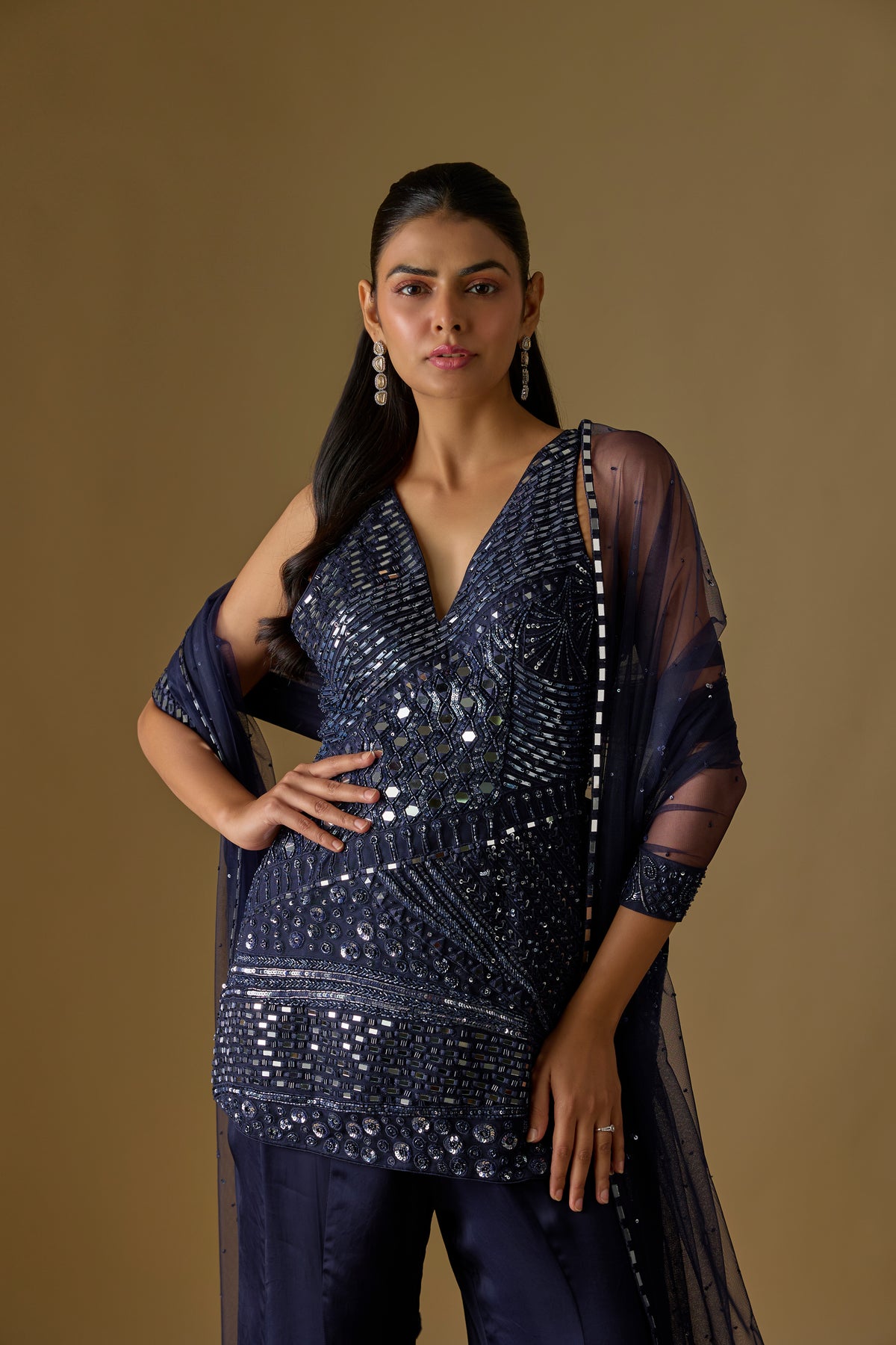 Elevate your festive elegance with Asaga’s Pearl Marina Navy Blue Kurta, paired with a flowing plain sharara and a beautifully detailed Zentangle dupatta. Crafted in luxurious satin and tulle, this ensemble blends timeless charm with contemporary artistry. The rich navy hue adds sophistication, making it perfect for weddings, sangeet, and special occasions. A statement outfit designed for effortless grace and modern tradition.