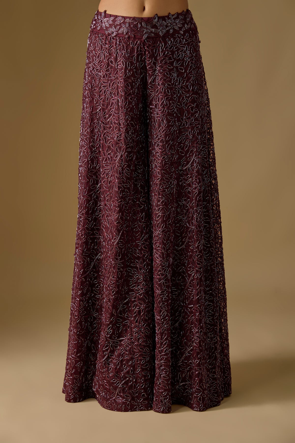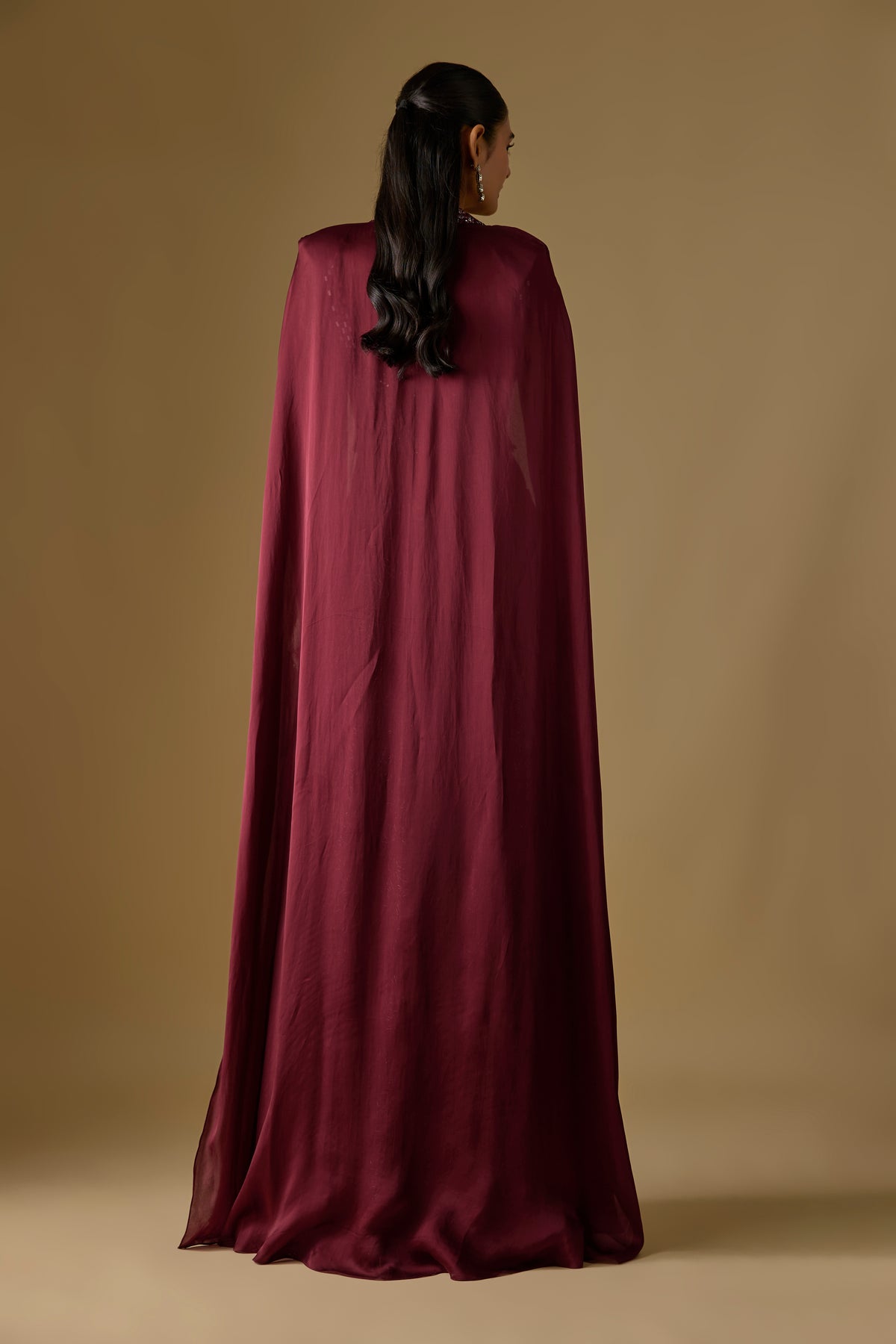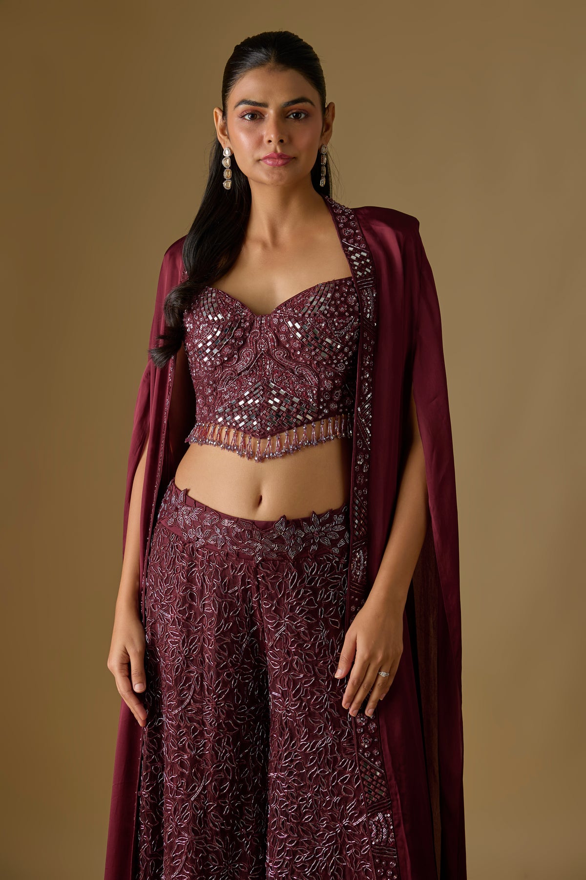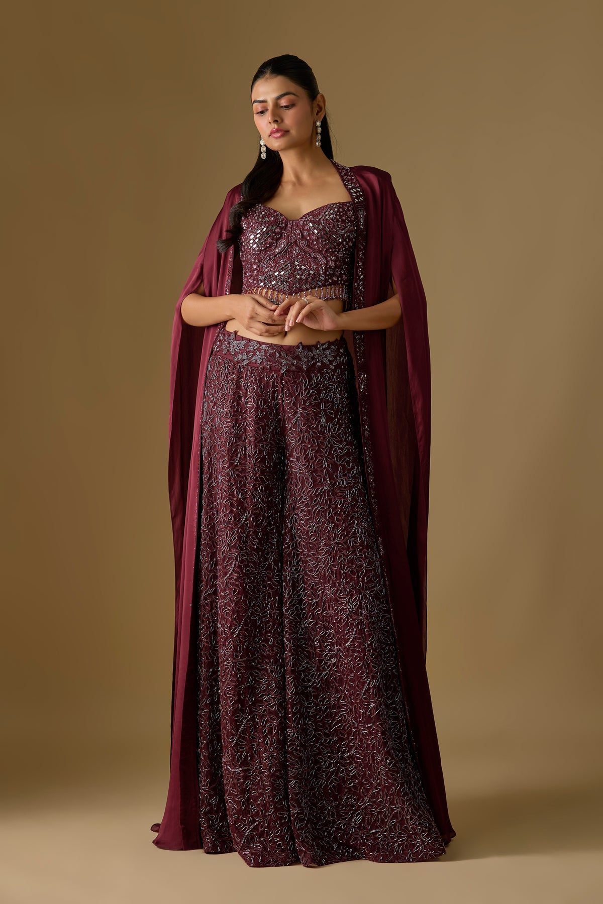 Elevate your festive elegance with the Navara Sharara Set from the Asaga collection, featuring a rich wine-toned sharara paired with a structured corset blouse. The flowing long cape in luxe satin and delicate tulle adds a regal touch to your ensemble. Designed as a three-piece set, this outfit blends contemporary charm with traditional artistry. Perfect for weddings, receptions, and glamorous celebrations.