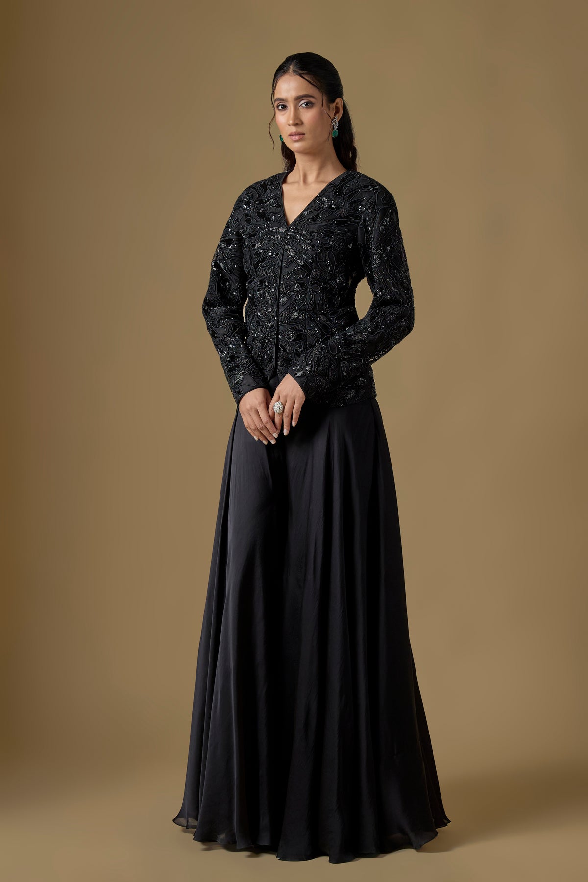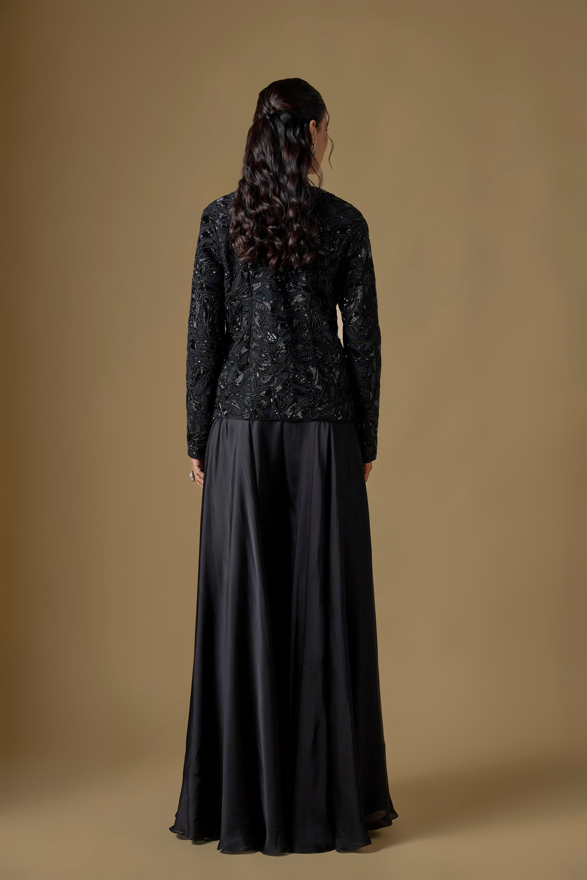 Elevate your festive wardrobe with the Rillette Jacket Sharara Set, featuring a stunning black hand-embroidered short jacket paired with luxurious satin organza sharara pants. Designed to blend contemporary elegance with traditional craftsmanship, this two-piece ensemble offers effortless sophistication for weddings, celebrations, and special occasions. Crafted from premium satin and tulle, it promises a graceful silhouette with a touch of glamour. Perfect for those who love statement styles with refined detailing.