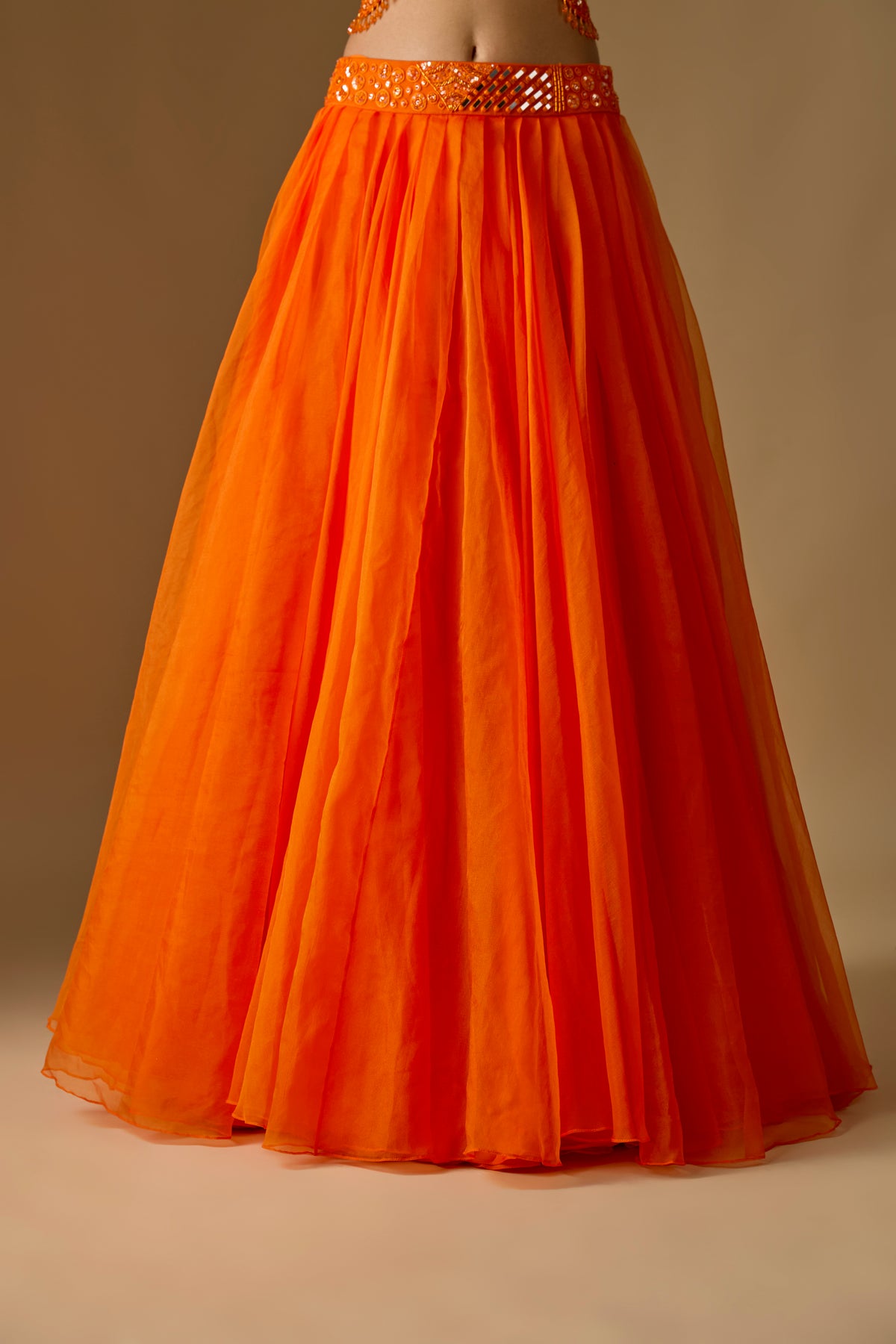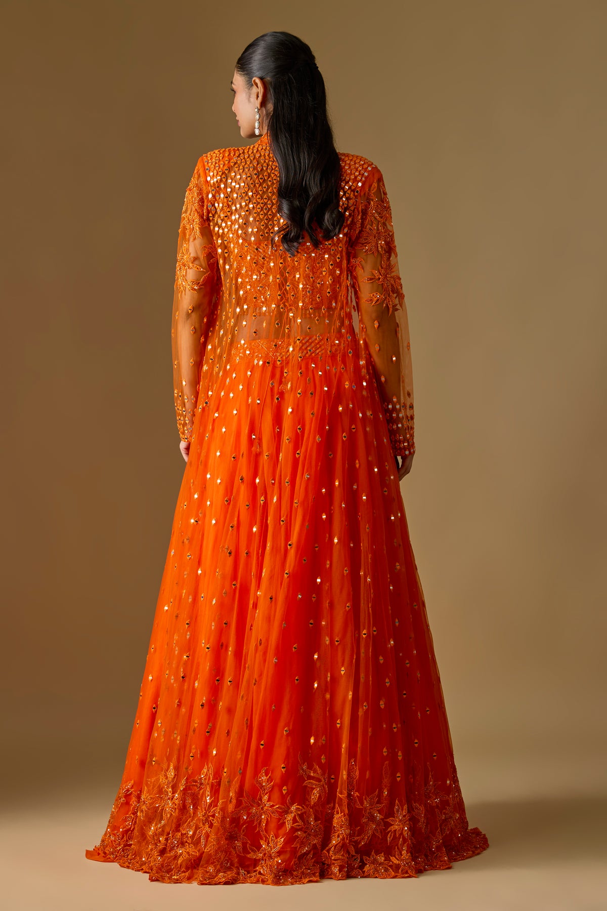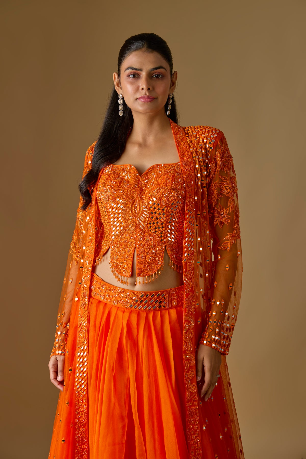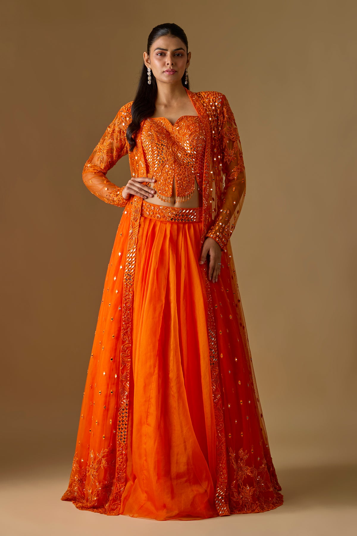 Salora Long Jacket Set features a stunning orange long jacket paired with a chic corset blouse and a flowy organza lehenga, perfect for festive and wedding occasions. Crafted from premium organza, satin, and tulle, this three-piece ensemble delivers elegance with modern charm. The rich textures and vibrant hue elevate your traditional wardrobe effortlessly. Designed for comfort and style, this set ensures a graceful, head-turning look at every celebration.
