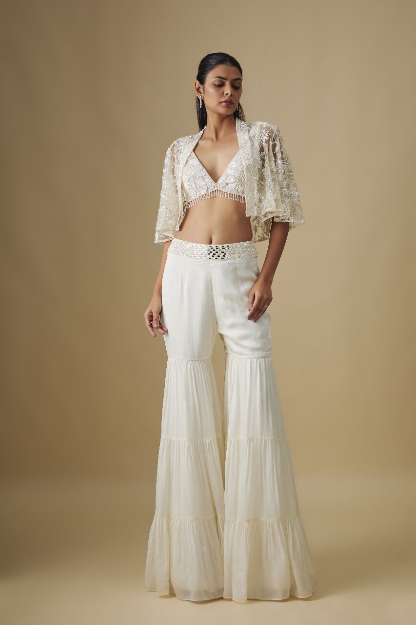 Radiating timeless elegance, this Ivory Sharara set by Asaga blends traditional artistry with contemporary charm. The intricately hand-embroidered mirror-work blouse pairs beautifully with flowing sharara pants, creating a graceful silhouette. A sheer, lightweight cape drapes effortlessly, adding a touch of modern sophistication to the ensemble. Perfect for festive occasions and weddings, this set embodies Asaga’s ethos — rooted in heritage yet designed for the modern woman.