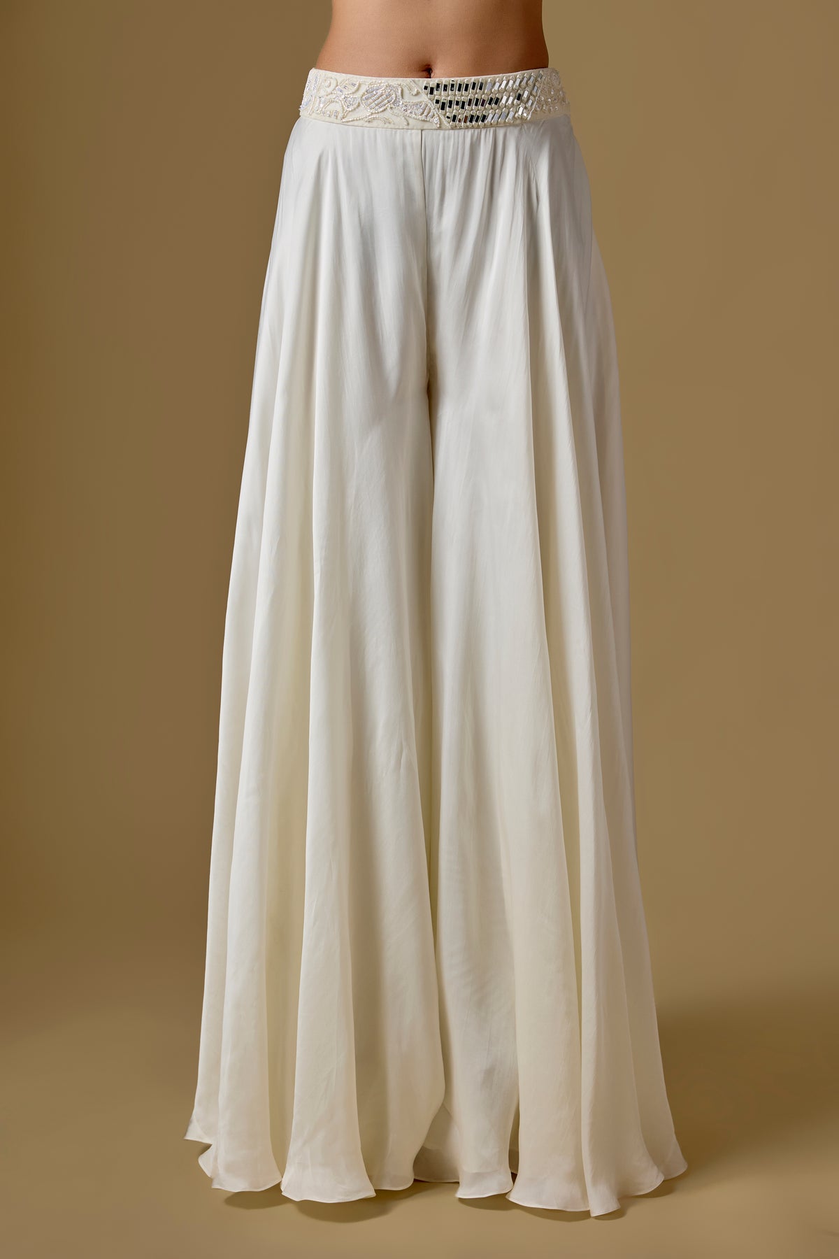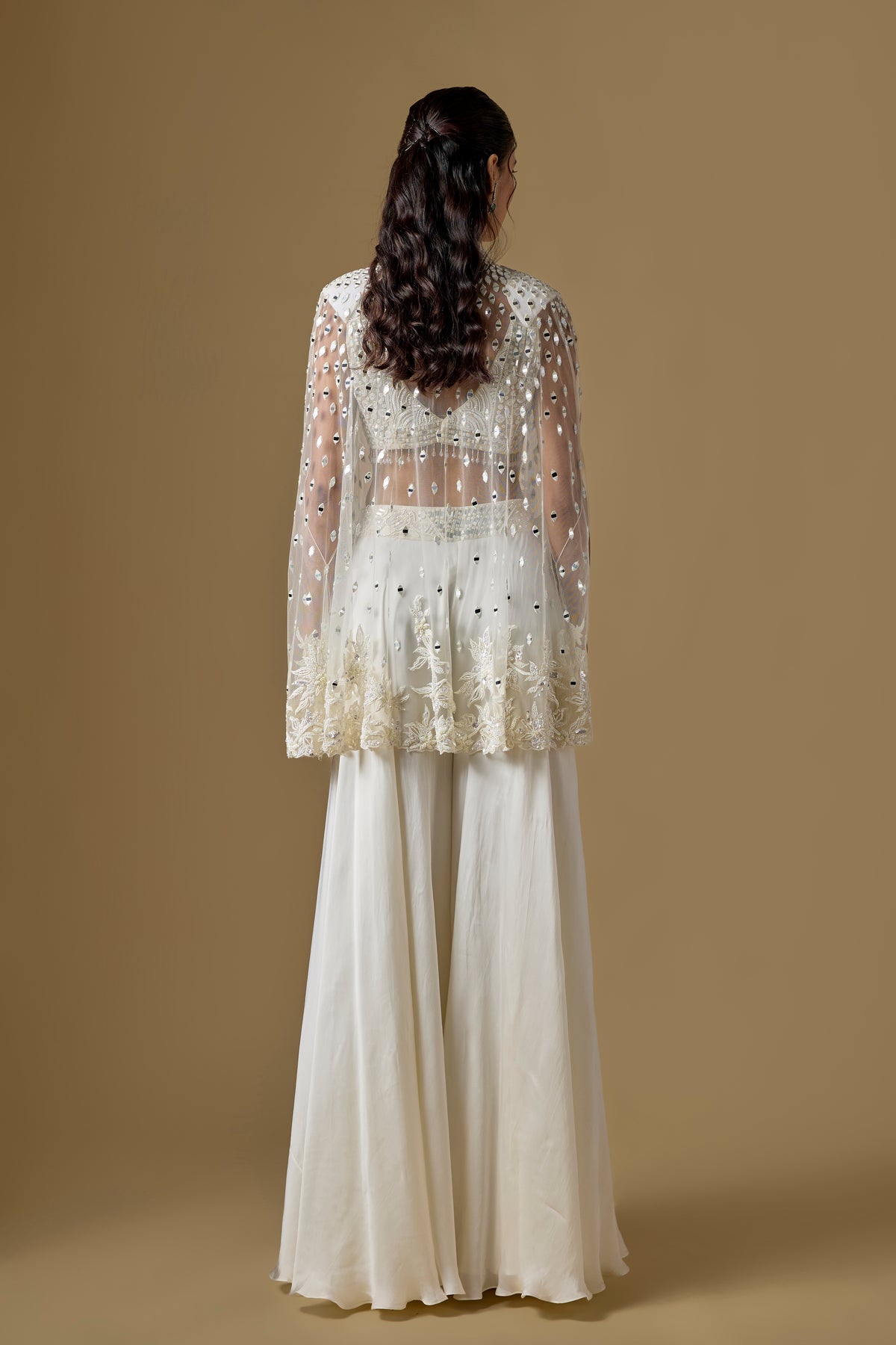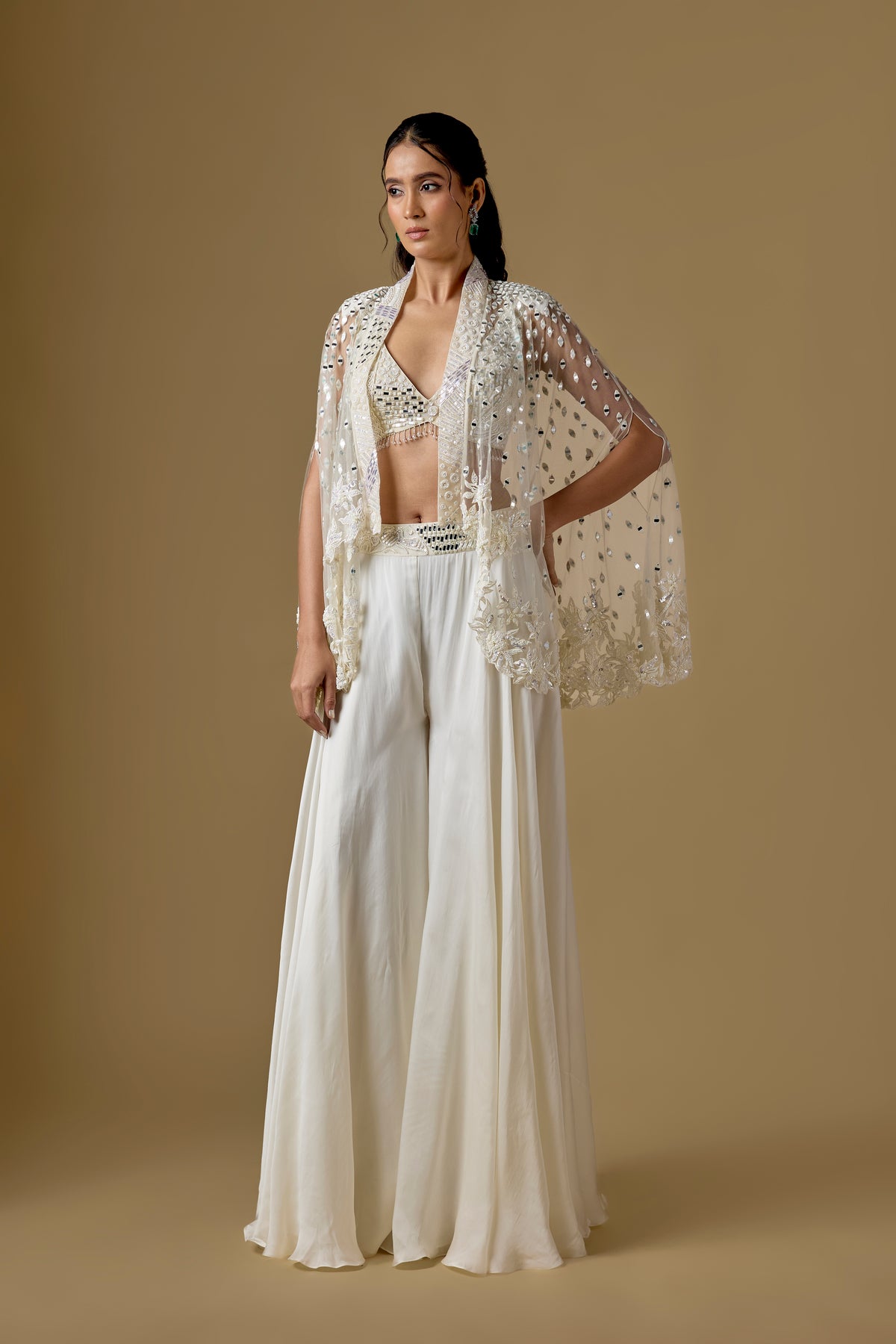 Elevate your festive wardrobe with this elegant ivory Sharara short cape set, featuring a beautifully detailed Zentangle blouse. Crafted from luxurious satin and airy tulle, the ensemble blends modern artistry with timeless charm. The flowing sharara paired with the chic cape creates a statement silhouette perfect for weddings, soirées, and celebrations. A versatile 3-piece set designed to bring grace and sophistication to every occasion.