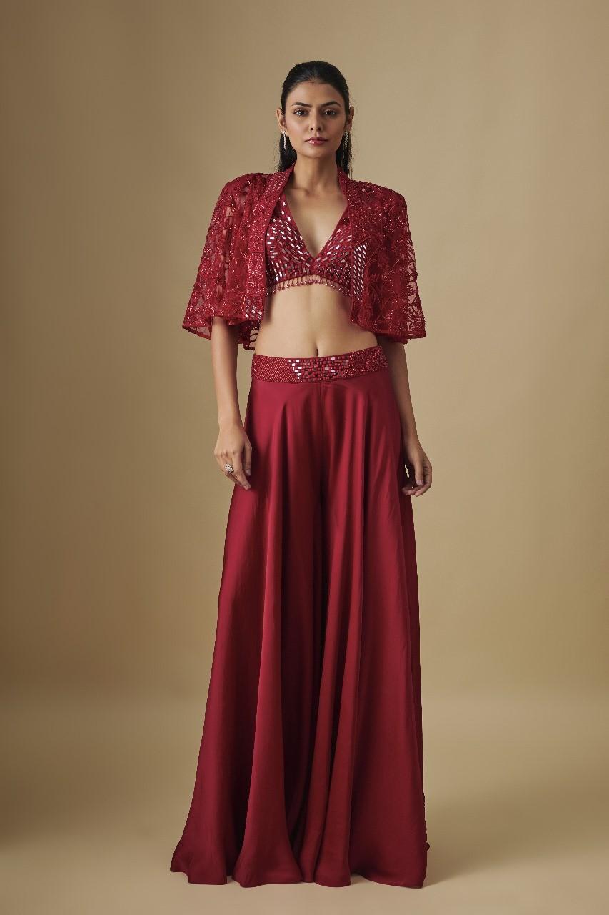 Radiating timeless elegance with a modern edge, this red sharara set from Asaga is a statement of celebration. The intricately embellished mirror-work blouse catches every glimmer of light, while the flowing cape adds a touch of ethereal charm. Paired with a graceful sharara, this ensemble beautifully blends tradition with contemporary flair — perfect for weddings, festive soirées, or special occasions.