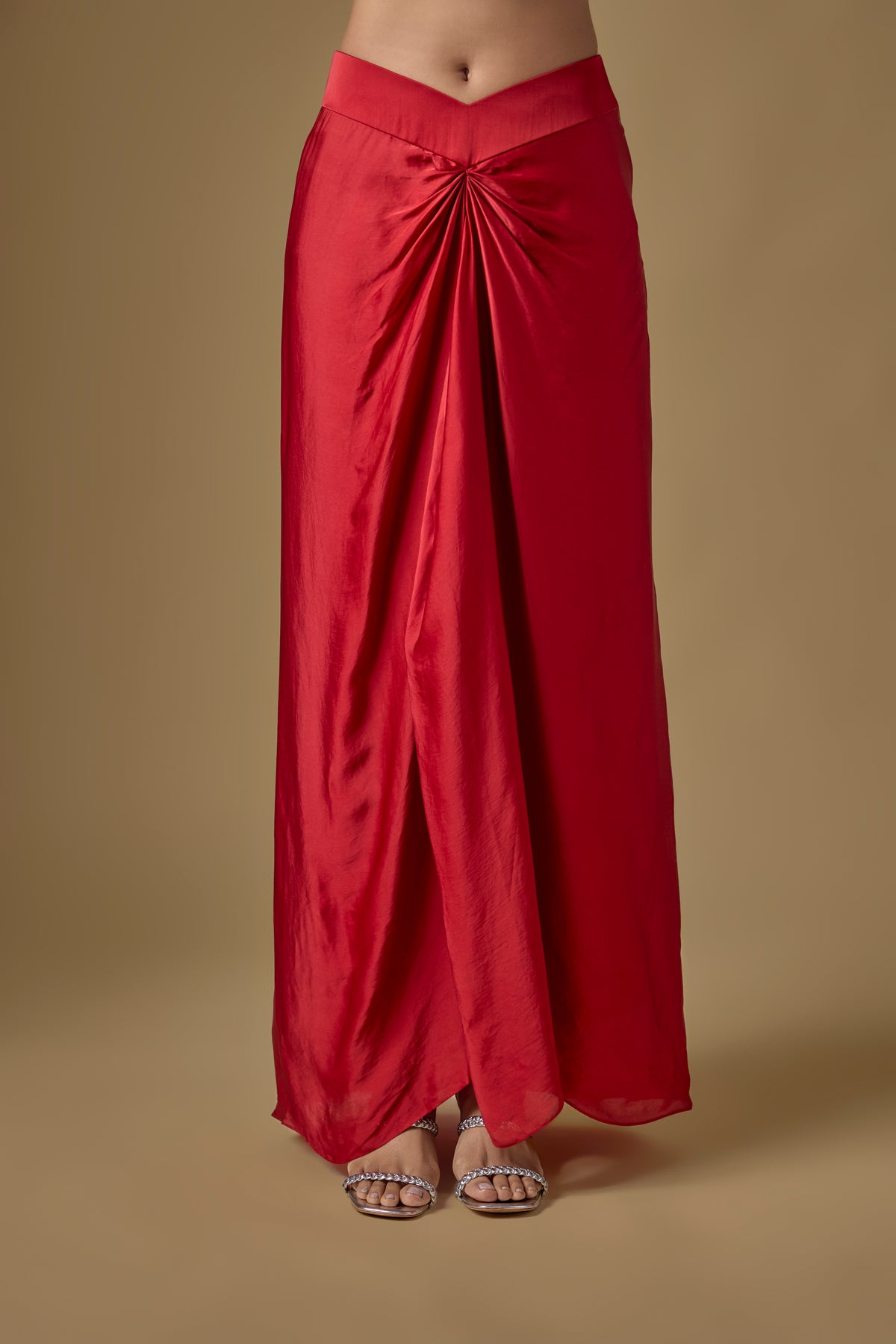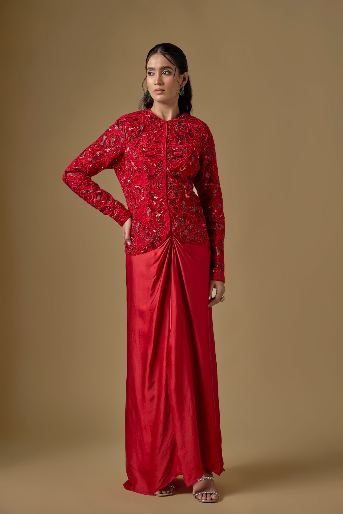 Elevate your festive elegance with the Torrin Jacket Drape Set, crafted to make a bold statement. Featuring a luxurious red tulle jacket adorned with intricate hand embroidery, this ensemble blends tradition with modern glamour. The fluid satin organza drape adds graceful movement, enhancing its sophisticated silhouette. Made from premium satin and tulle, this two-piece set is perfect for weddings, celebrations, and high-fashion occasions.