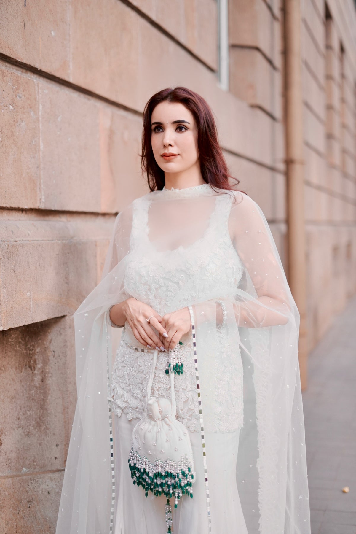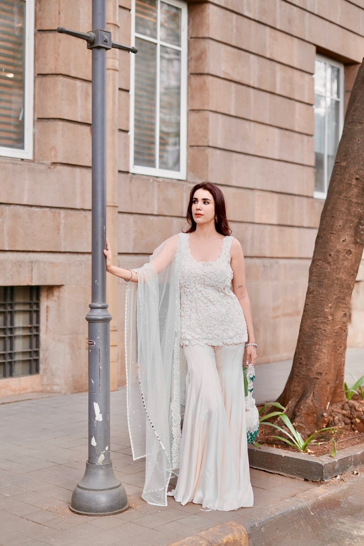 Ivory hand-embroidered short kurti paired with sharara and matching dupatta in satin organza and tulle fabric.