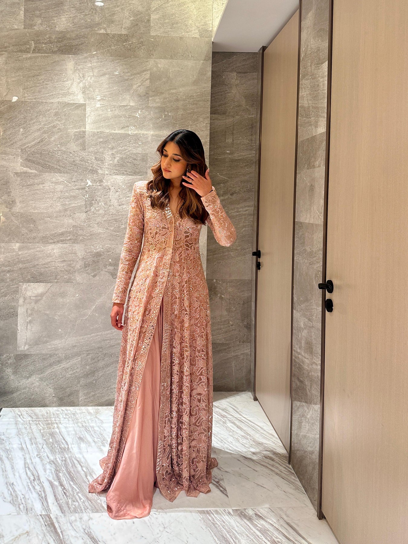 Elevate your festive elegance with the Shattuck Jacket Set from Asaga’s Chique collection, crafted in a luxurious rose-gold palette. The long embellished jacket features fine embroidery and shimmering sequin work, paired with a graceful blouse and flowy sharara for a refined, contemporary look. Made using premium satin, organza, chinon, and tulle, this three-piece set blends richness with effortless movement. A perfect designer ensemble for weddings, sangeet nights, and grand celebrations.