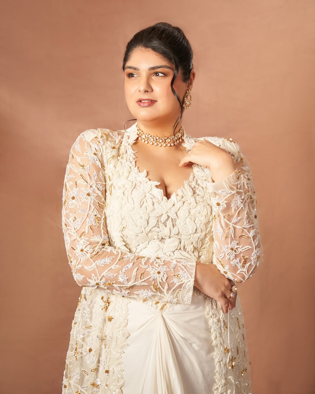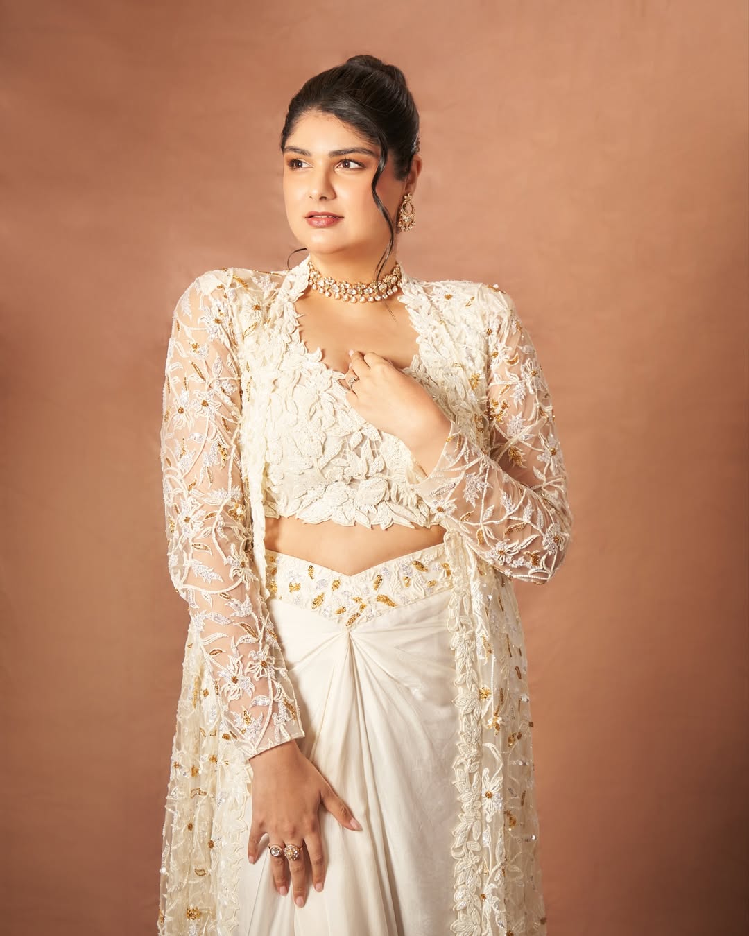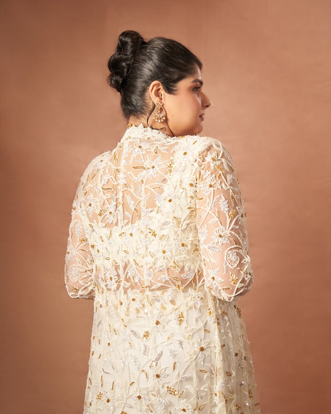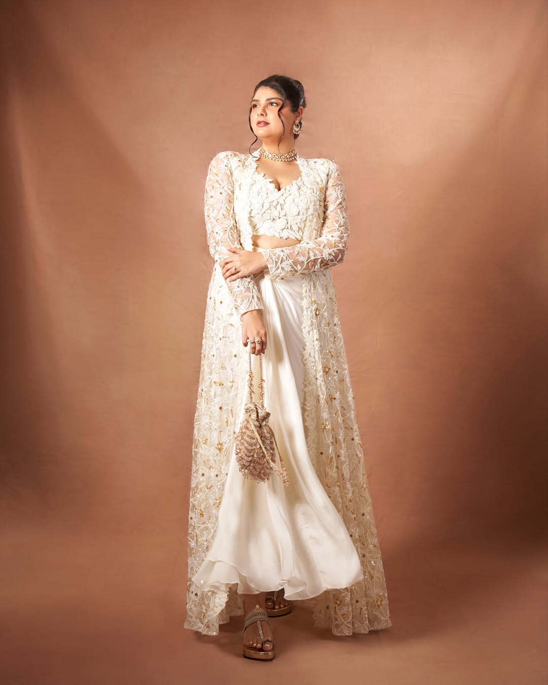 Step into celebrity-inspired glamour with Asaga, featuring a Moon Pie fully embroidered blouse paired with a chic drape skirt and an intricately embellished jacket. Crafted in luxurious satin, organza, and tulle, this three-piece ensemble blends elegance with contemporary flair. The rich embroidery and fluid drapes make it perfect for festive celebrations, red-carpet moments, and statement occasions. Elevate your style with this standout celebrity look designed to turn heads.
