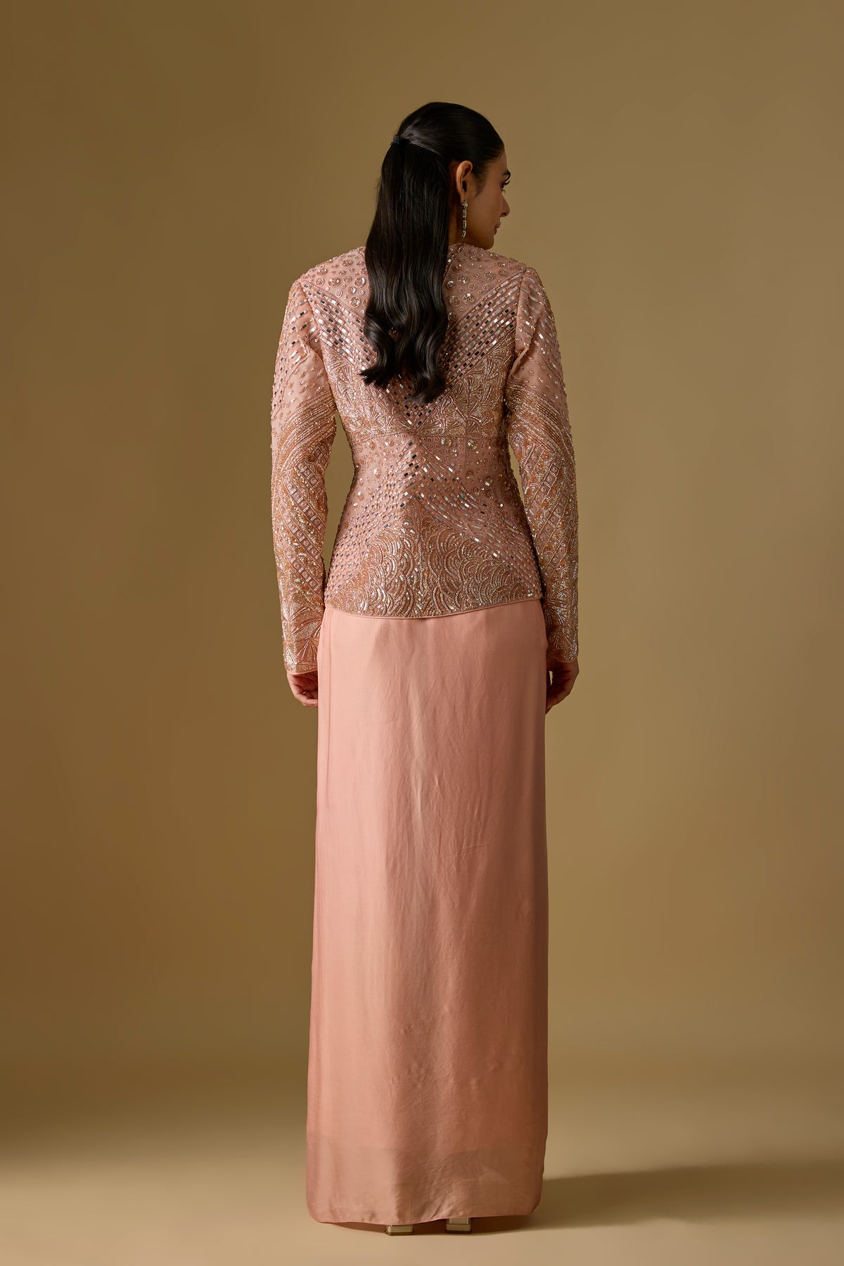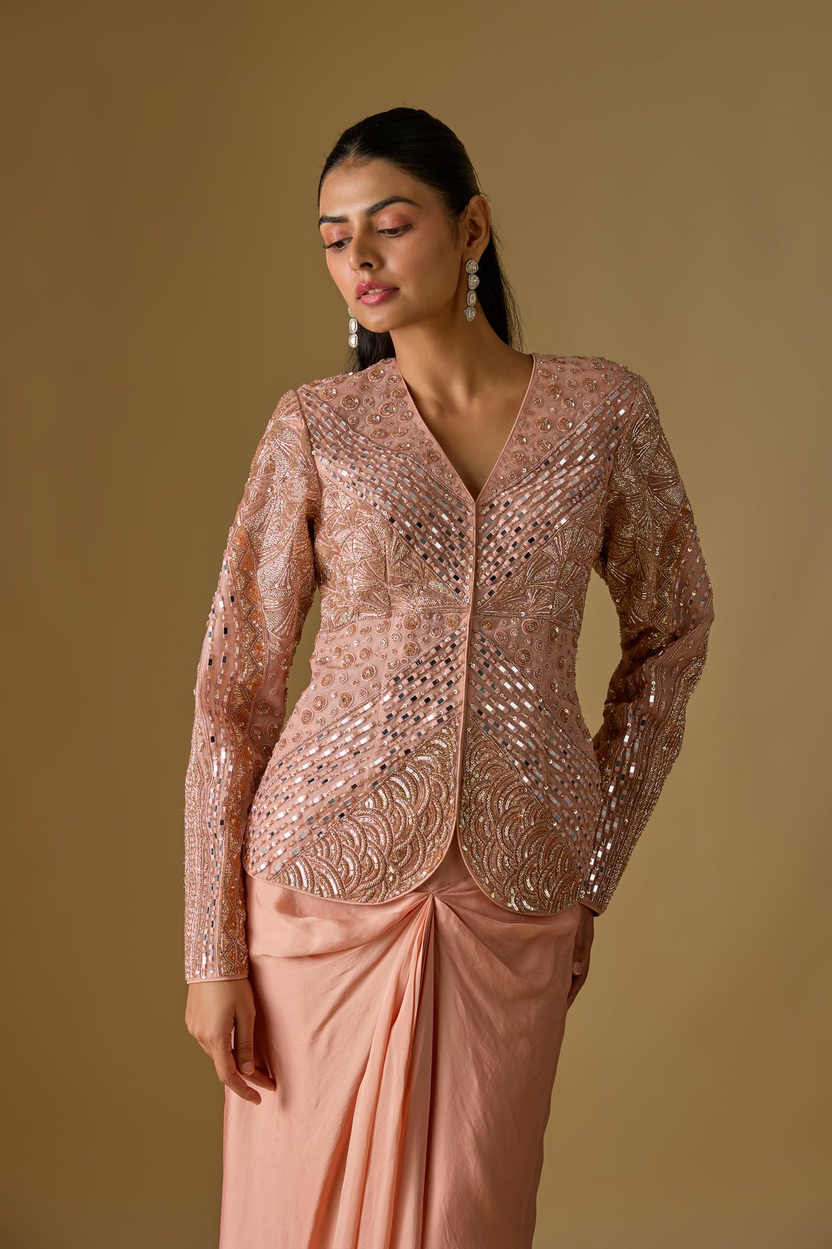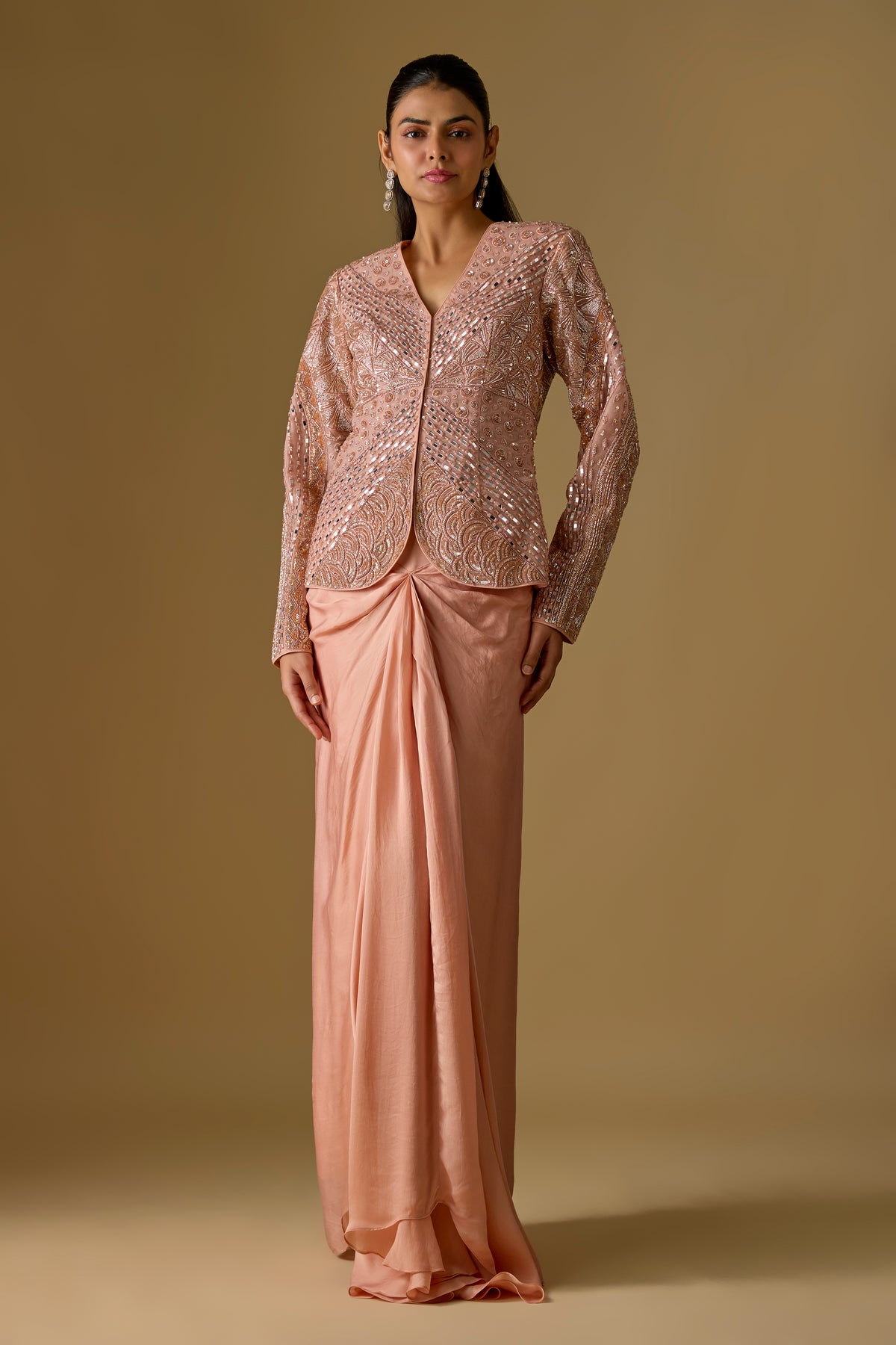 The Coraqua Jacket Set from the Asaga collection features a rose-gold short jacket crafted in tulle with intricate hand embroidery. Paired with a fluid satin-organza draped skirt, this two-piece ensemble blends luxury craftsmanship with modern elegance. Designed in premium satin and tulle, it offers a refined statement for festive and special occasions. Perfect for weddings, sangeet celebrations, and elevated evening wear.