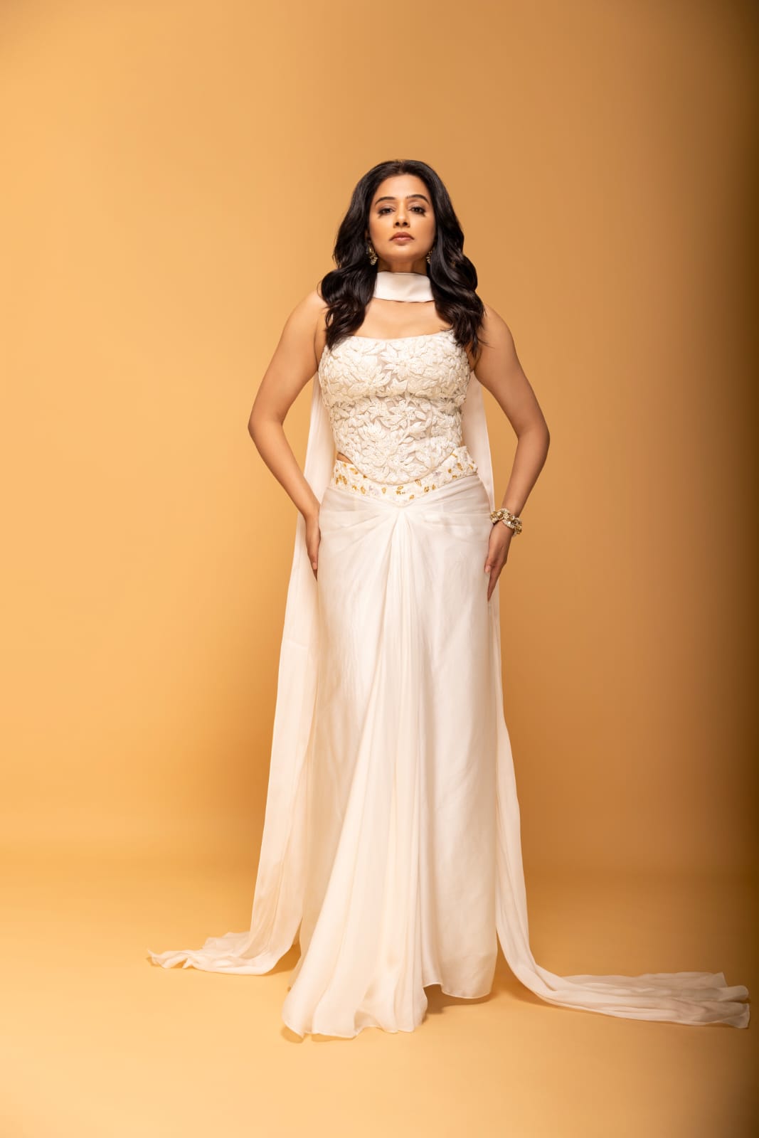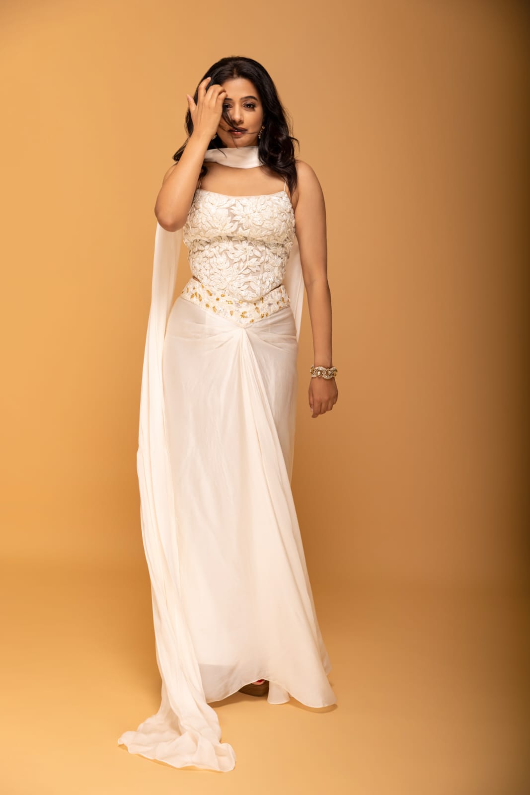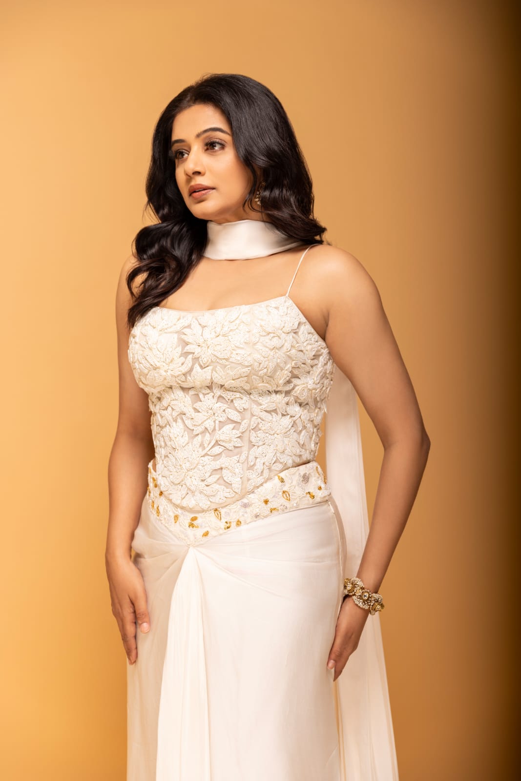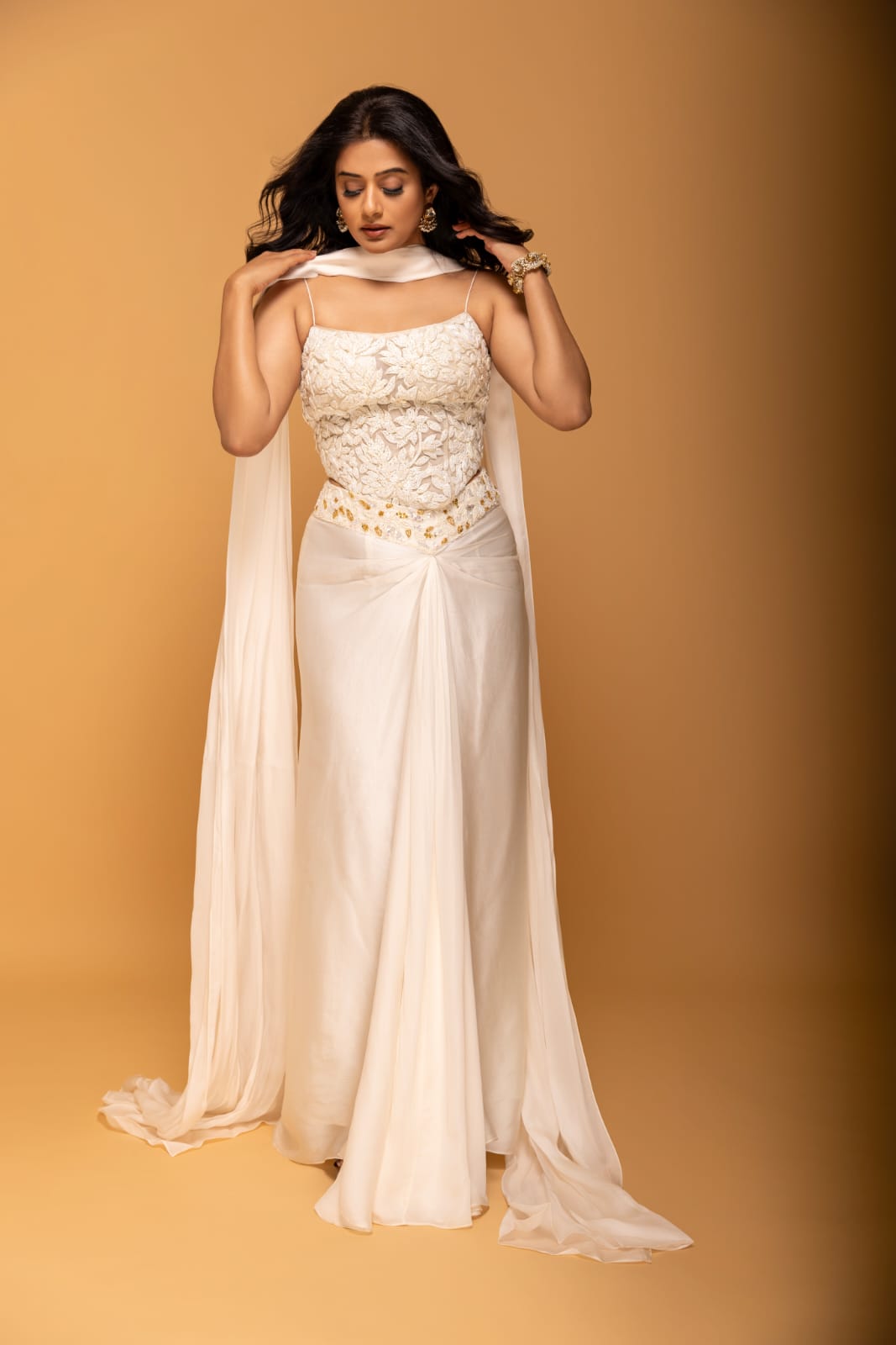 Elevate your occasion wardrobe with the timeless elegance of the Meadora ensemble from ASAGA. Crafted in a serene ivory hue, this statement piece features a structured corset blouse designed to sculpt and flatter the silhouette with effortless grace. The intricate tailoring enhances the feminine form, offering a perfect balance of sophistication and modern allure.